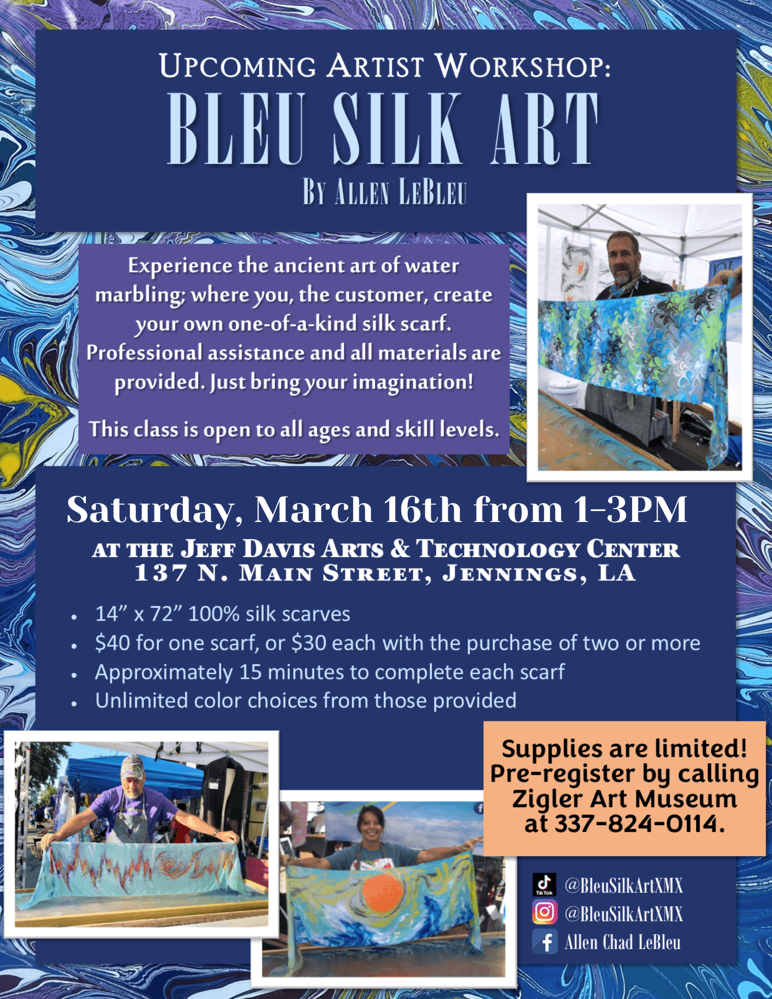 We can’t wait to learn this magical process! WATER MARBLING workshop by Allen LeBleu coming March 16th to the Jeff Davis Parish Arts & Technology Center! Supplies are limited, so call or visit us TODAY to register!